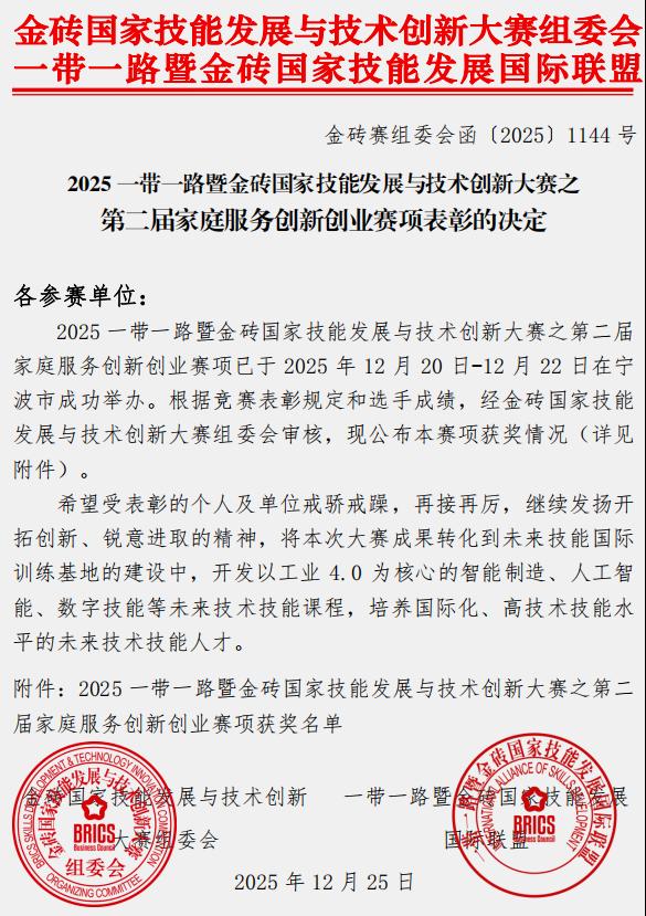 2025一带一路暨金砖国家技能发展与技术创新大赛之第二届家庭服务创新创业赛项于12月20日-22日在宁波卫生职业技术学院成功举办。作为聚焦技能发展与国际合作的高水平赛事平台,本次大赛吸引了全国多省份中职组、高校组、国际组、教师组众多队伍同台竞技,旨在推动家庭服务领域创新创业实践,培养国际化技术技能人才。