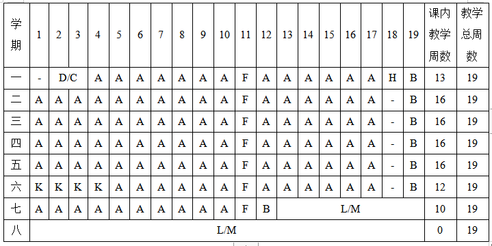 符号说明:A课堂教学 B考试 C入学教育 D军事训练 E社会调查与实践 F公益劳动 G课程设计 H认识实习 I金工实习 J电工实习 K专业实习 L毕业实习 M毕业设计(论文) N假期