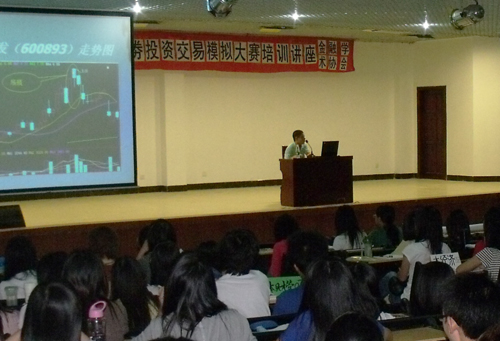 2009年10月13日在六栋学术报告大厅进行了证券投资模拟交易大赛的培训讲座。两轮培训讲座,共6场,在指导老师的悉心培训下,参赛者们提高了证券投资的理论水平,使得“科学理财”投资理念深入“投资者”们的心里。