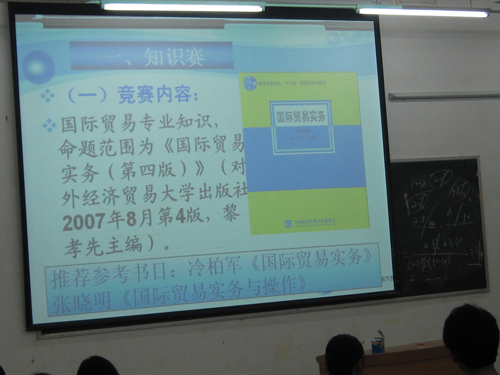 12月1日晚上9:20~10:30,财经系国际贸易专业知识竞赛(全国第四届国际贸易专业知识竞赛)动员大会在6#103顺利召开。财经系副主任胡智敏老师、国贸教研室主任黄爱青老师、本次大赛的指导老师蒋晶老师和王红平老师及报名参赛的170余名学生参加了本次动员大会。