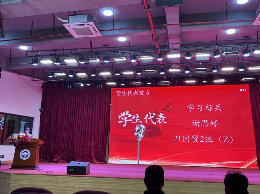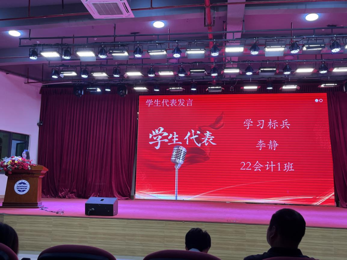 学生代表21国贸2班谢思婷和22会计1班李静发言。她们首先感谢学院全体老师和同学们的帮助,回顾自己在学习过程中的经历和取得的成绩,分享自己如何通过努力、勤奋和科学的学习方法取得了优异的成绩,激励其他同学继续努力,追求卓越,以实现自己的目标。