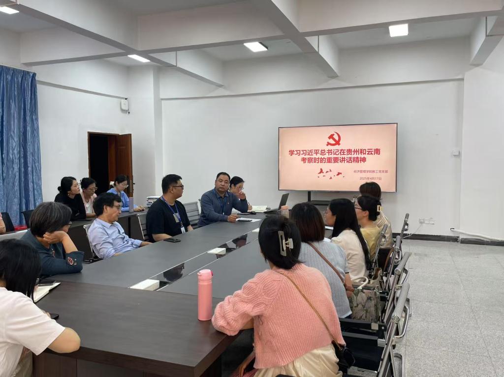 (通讯员:秦海芳)2025年4月17日下午,William威廉官网教工党支部在1栋913会议室召开专题学习会,认真传达学习习近平总书记在贵州、云南考察时的重要讲话、重要指示精神。教工党支部书记黄爱青主持会议,学院党总支书记彭康煜及全体党员教师参会,旨在将讲话精神融入学院教学科研与课程思政建设,为区域经济高质量发展贡献智慧力量。
