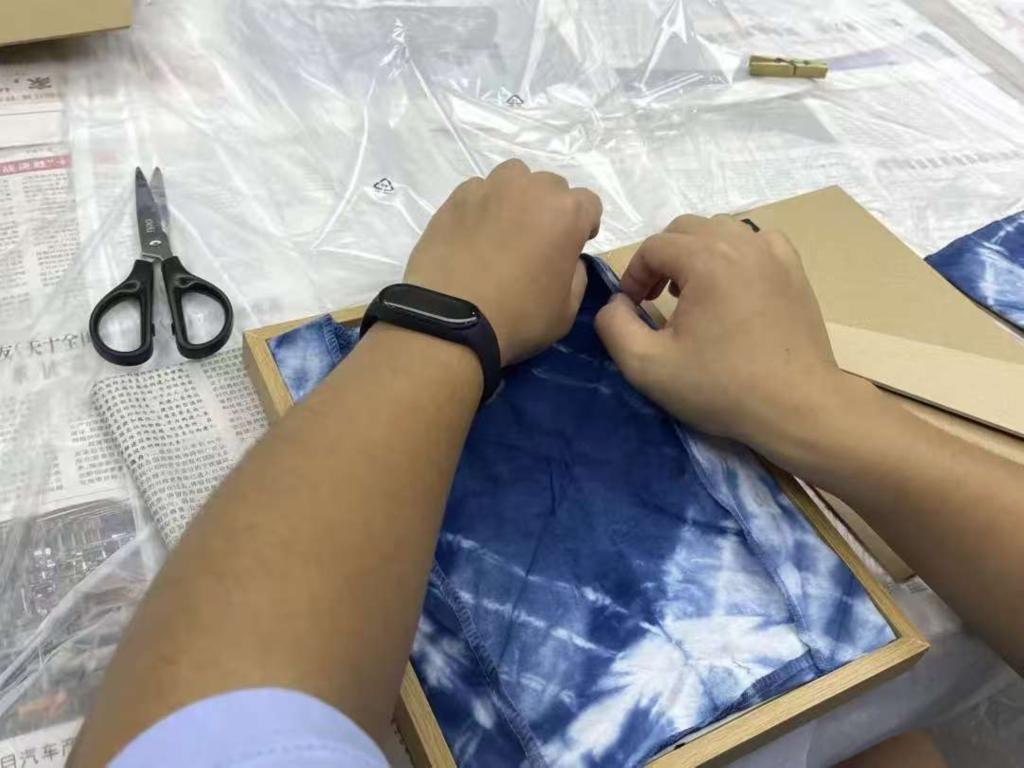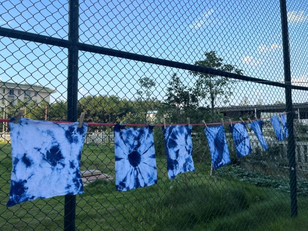 在扎染创作过程中,学生们将红色主题巧妙融入方寸织物之间,以布为纸,以染为墨,在素白织物上勾勒出充满时代温度的艺术表达。有的通过几何纹样与符号组合,传递出同心向党、团结奋进的精神内涵,有的则借助意象化的设计语言,用连绵的波纹与光芒纹展现了砥砺前行的精神图景。在“一站式”学生第九社区这一创新实践平台上,学生们不仅亲手体验了扎染技艺的古韵新姿,更在经纬交错间体会到匠心坚守与文化传承的深刻意义。每一幅亲手染就的作品,既是技艺与感悟的结晶,也承载着对红色基因的自觉传承与时代诠释。