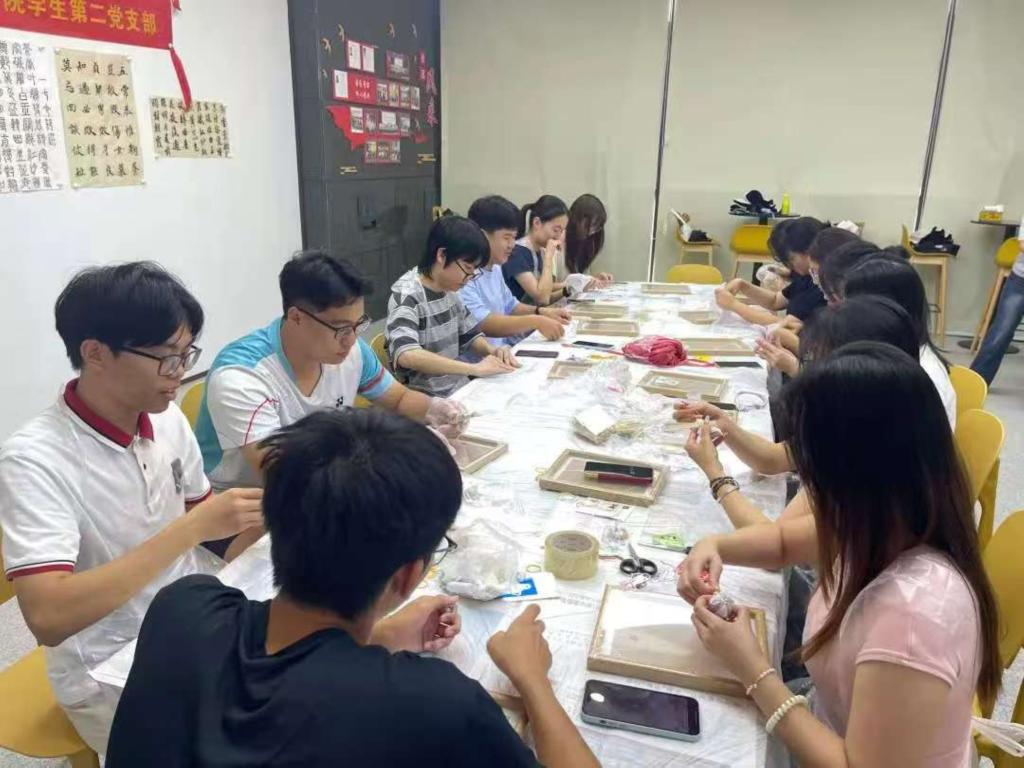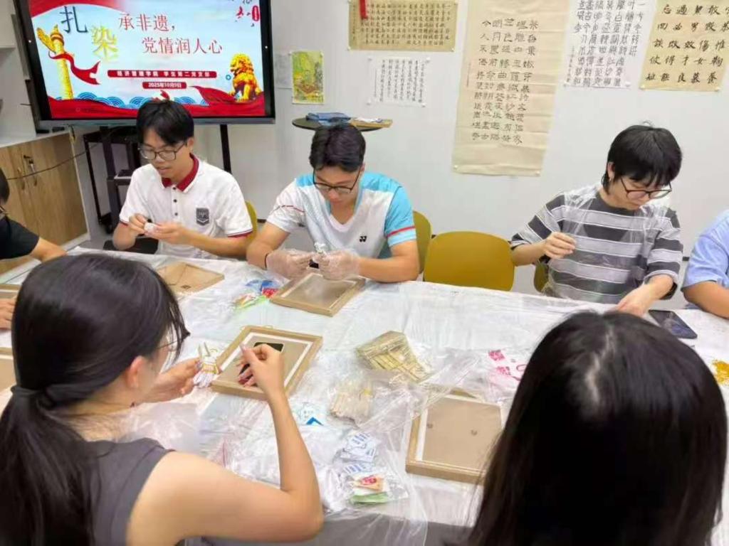 扎染是一门历史悠久的织物染色技艺,承载着深厚的民间智慧与文化记忆。它以线绳为笔,以布为卷,通过捆扎、缝合、夹压等手法,在布帛上创造出千变万化的纹理与图案。活动伊始,支部负责人为大家播放视频,让大家了解扎染的发展脉络以及扎结的技巧与染色的时间等内容。学生们认真观看,对即将动手体验的环节充满期待。视频播放结束后,大家自由发挥,通过不同的捆扎方式与染色层次,创作出一件件纹样别致、色彩斑斓的扎染作品,每一幅都蕴含着亲手制作的温度与美感。