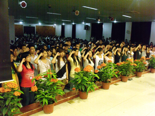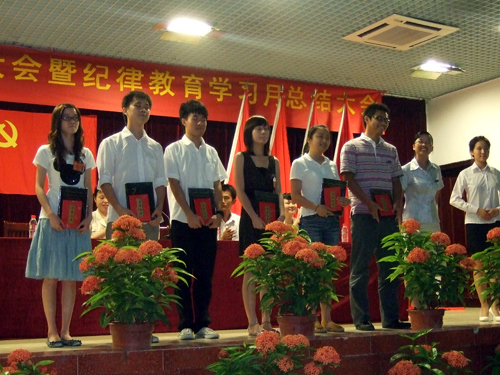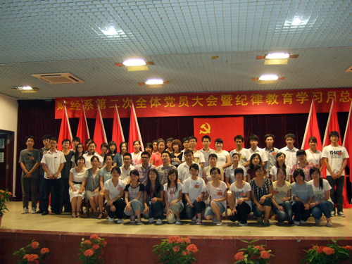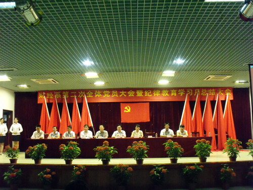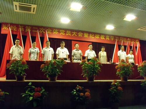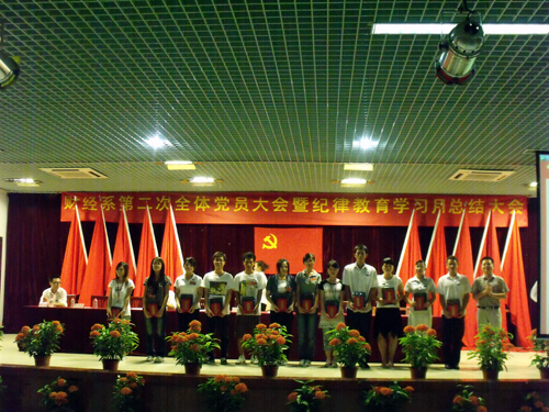 大会在激情澎湃的国歌声中拉开帷幕。财经系教职工党支部与学生党支部代表就“2009——2010年年度工作总结暨纪律教育学习月总结”向大会作汇报。随后,127名预备党员在党总支统战委员黄爱青同志的带领下举行宣誓仪式,预备党员们用洪亮的声音坚定地表达出他们忠于党的决心和态度。接着,预备党员代表张爽同志发言,表示全体新党员将会履行党员职责,在学习、生活中以党员标准严格要求自己,树立模范带头作用,为党注入新鲜血液。