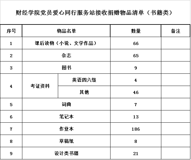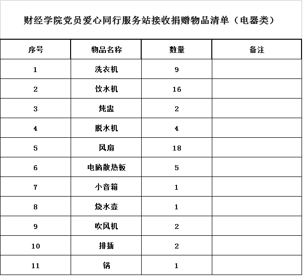 经过初步统计,本次捐献活动共收到洗衣机9台,饮水机16台,风扇18台,其它物品千余件。根据党委安排,这些物品将由我校今年暑假大学生党员社会实践队送往贫困山区,剩余物品留赠给我校即将入学的大一寒门学子。
