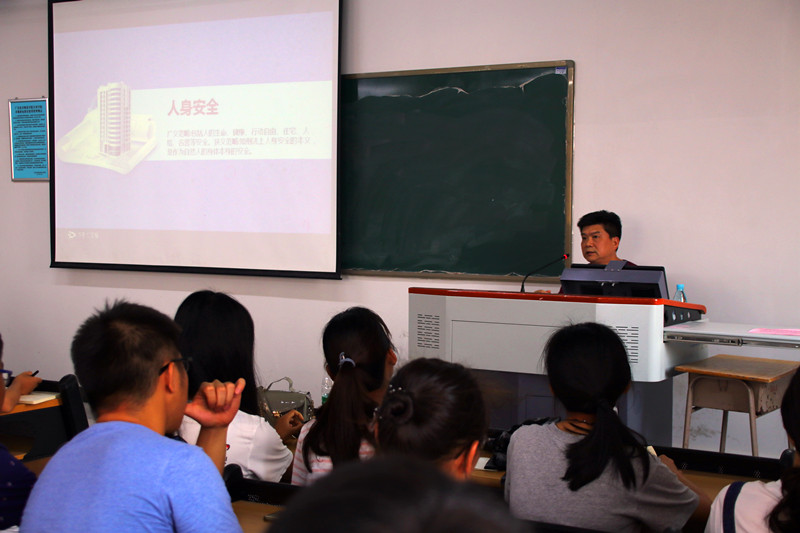 谭书记授课的主题是《大学生思想政治安全》。谭书记从国家安全、心理安全、人身安全、财产安全、网络安全、消防安全和社交安全等七个方面做了详细解读。授课过程,旁征博引,以例为证,循循善诱,利用身边的案例把授课的内容引入到同学们的学习、工作和生活当中。