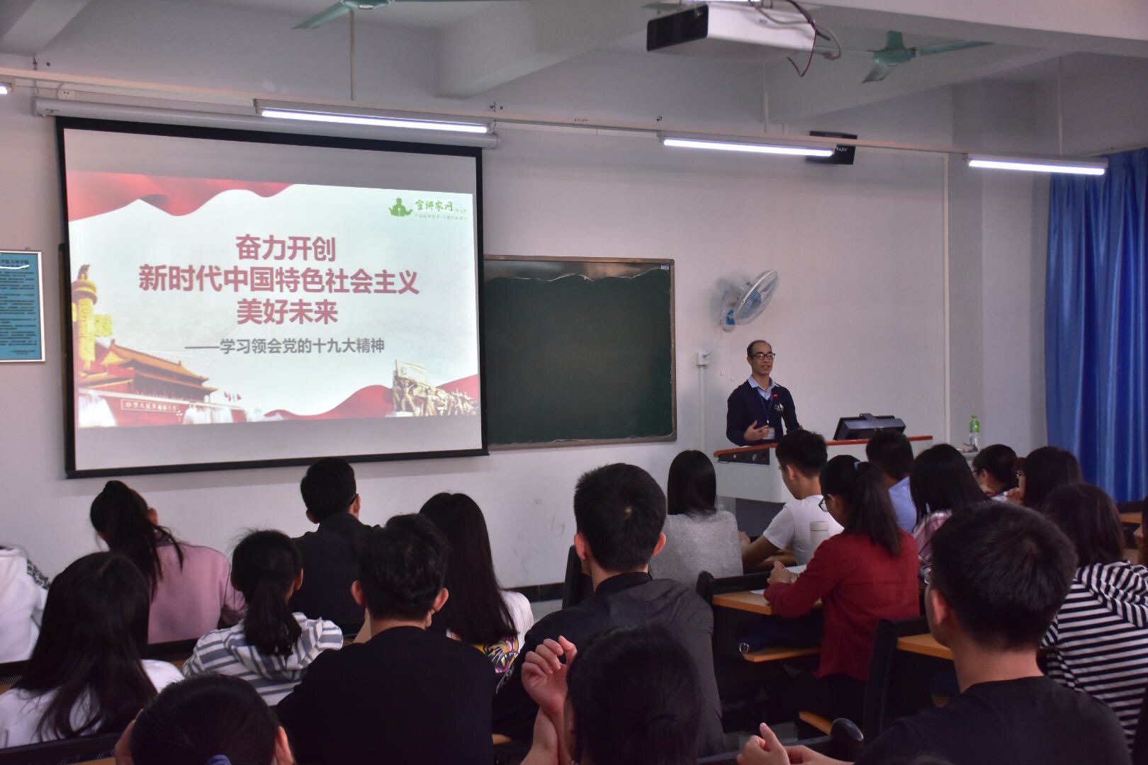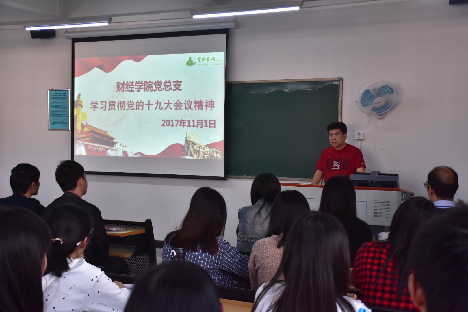 (通讯员 颜冬果)11月1日下午,根据学校党委部署,财经学院党总支组织教工党员、学生党员及积极分子,召开党的十九大精神专题学习会议。党总支书记谭飞在会议上讲话并强调,对党的十九大提出的新时代、新战略、新目标深感振奋,作为大学生党员,要在学习工作和生活上不忘初心,牢记使命,勇于担当,不断为学校的发展、社会的进步和国家繁荣做出应有的贡献。