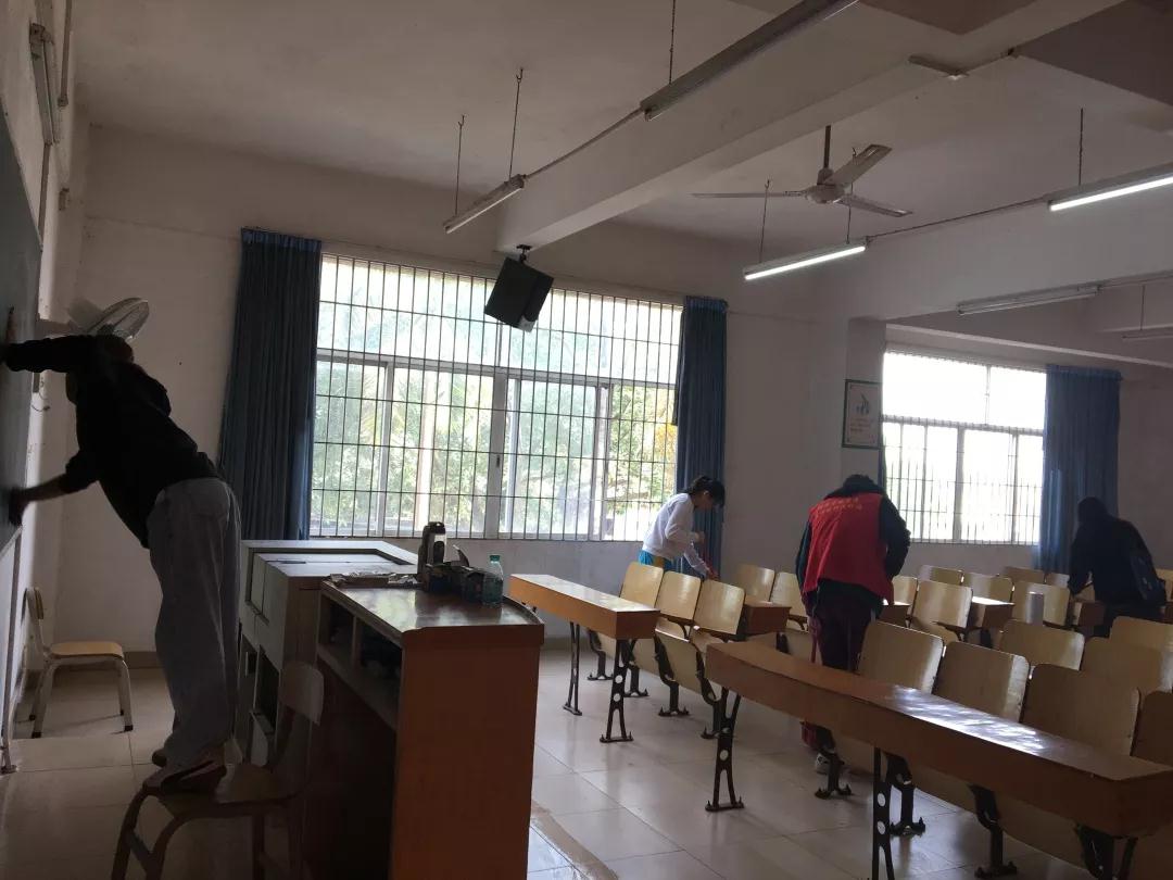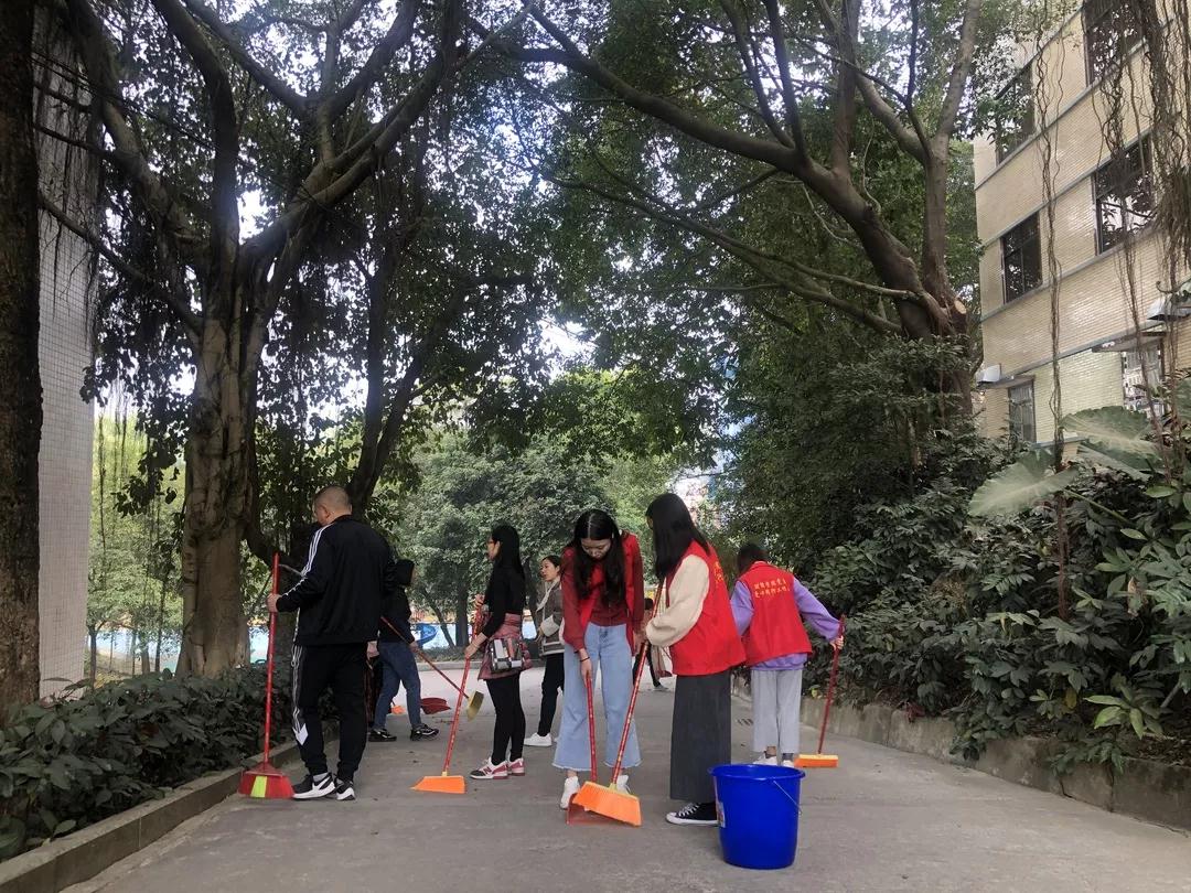 上午九点,所有师生党员在7栋教学楼前集合,开展校园环境卫生打扫。根据工作部署,部分师生党员在12栋教学楼附近学院指定的卫生区域进行卫生清洁,同志们拿起扫帚清扫地上的枯枝落叶,躬身捡起草丛里面的垃圾袋、烟蒂、纸巾等。部分师生党员分布在6栋教学楼和7栋教学楼相应的教室进行卫生清洁,檫黑板、扫垃圾、拖地等工作有条不紊地进行着。