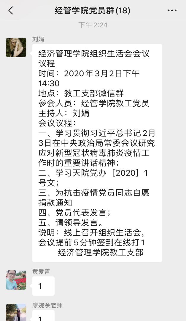 为进一步贯彻落实习总书记关于应对新冠肺炎疫情的重要指示精神,把疫情防控作为当前重大政治任务,保护好学院师生的生命健康,促进日后党建、教学、科研等工作的顺利开展。3月2日下午,William威廉官网教工党支部召开了以“凝心聚力众志成城,战“疫”授课两不落”为主题的线上专题组织生活会,本次会议由教工党支部书记刘娟主持,全体教工党员参加会议。