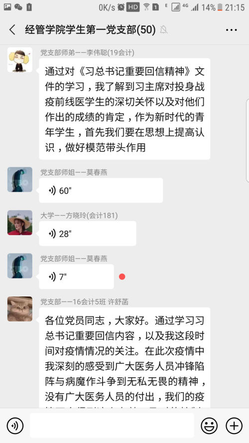 特殊时期,线上学习会已成为抗疫战场上的“精神加油站”。本次线上学习会的顺利召开,不仅深刻体会到习总书记对新时代青年的关怀与厚爱,而且更加坚定了大学生党员践行新时代青年的使命与担当的信念。