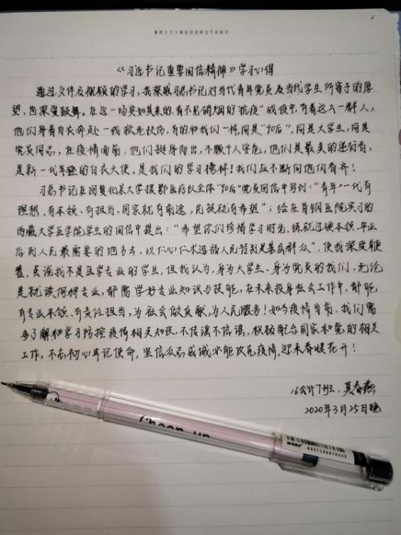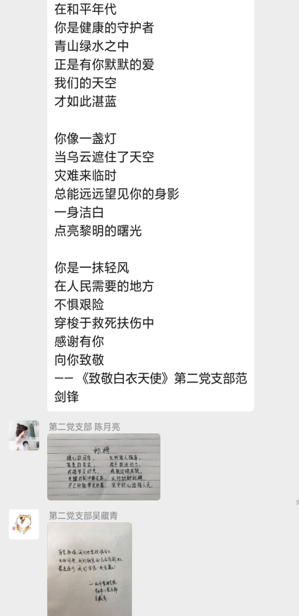 学生第二党支部全体党员通过阅读《习总书记重要回信精神》相关文件,体会到习近平总书记对17位西藏大学医学院学生在实习中认真锻炼临床基本功的肯定。通过观看《回信在首钢医院引起热烈反响》视频,感受到了青春的力量,青年一代“有理想、有本领、有担当,国家就有前途,民族就有希望”。会后,各党员同志通过编写诗歌散文,制作海报等特别的方式表达对在抗疫一线“战士们”的敬意以及对国家抗疫行动的支持。