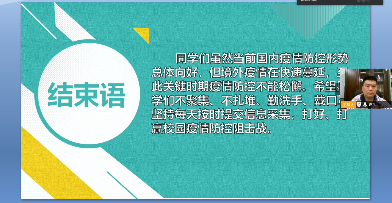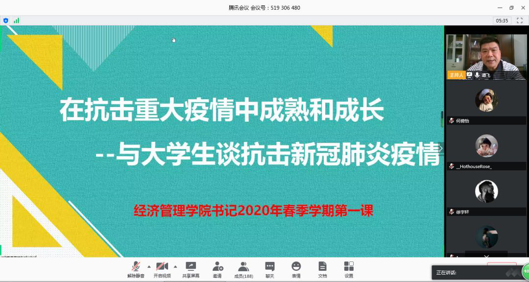 谭飞书记希望在这场关系到全体师生生命安全的战“疫”中,青年学生要勇于担起自己的责任。一是要提高认识,做好疫情防控措施,少出门、勤洗手、戴口罩,保障好自己和家人的身体健康;二是要自觉把疫情当课堂,上好抗疫这堂实践课,在抗击重大疫情中成长和成熟;三是要向奔赴在抗疫一线的逆行者和我院积极参与疫情防控中的志愿者学习,做一个有责任、有担当的时代青年。最后,谭书记强调,全体师生要坚持每天按时提交信息采集,在未收到学校正式开学通知前均不得提前返校。