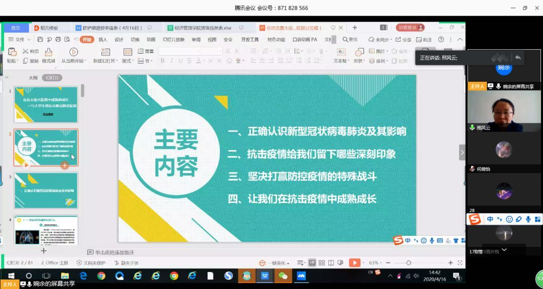 邢风云院长以《在抗击重大疫情中成熟和成长——与大学生谈抗击新冠肺炎疫情》为主题,围绕当前发生的肺炎疫情状况为大家解读了四个方面的内容:正确认识新冠肺炎疫情及其影响、抗击疫情不可忘却的印象、坚决打赢防控疫情的特殊战斗、让我们在抗击疫情中成熟成长,旨在通过讲解帮助广大师生正确认识新冠肺炎,了解疫情状况给大家带来的影响,树立坚决打赢防控疫情这场人民战争、总体战、阻击战的信心和勇气。