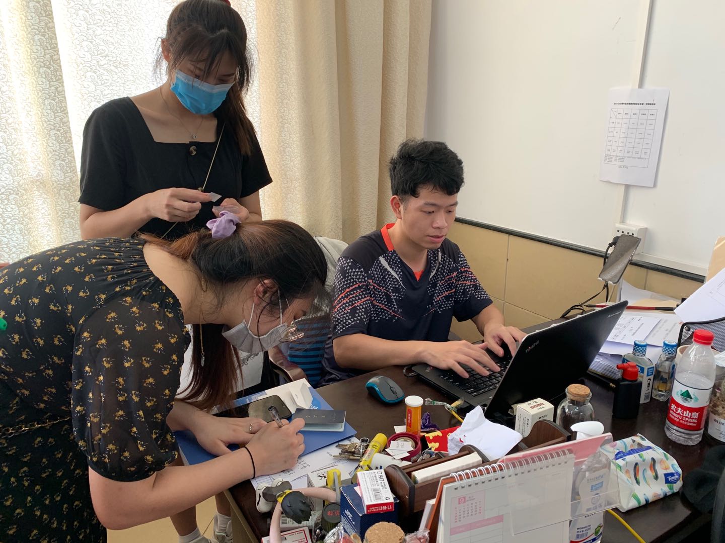 我院积极做好疫情防控期间毕业生离校的教育管理,全力对毕业生论文、论文指导资料、实习报告收集及创业就业指导。瞧,论文指导老师身边簇拥着一群渴望答疑的小可爱们。