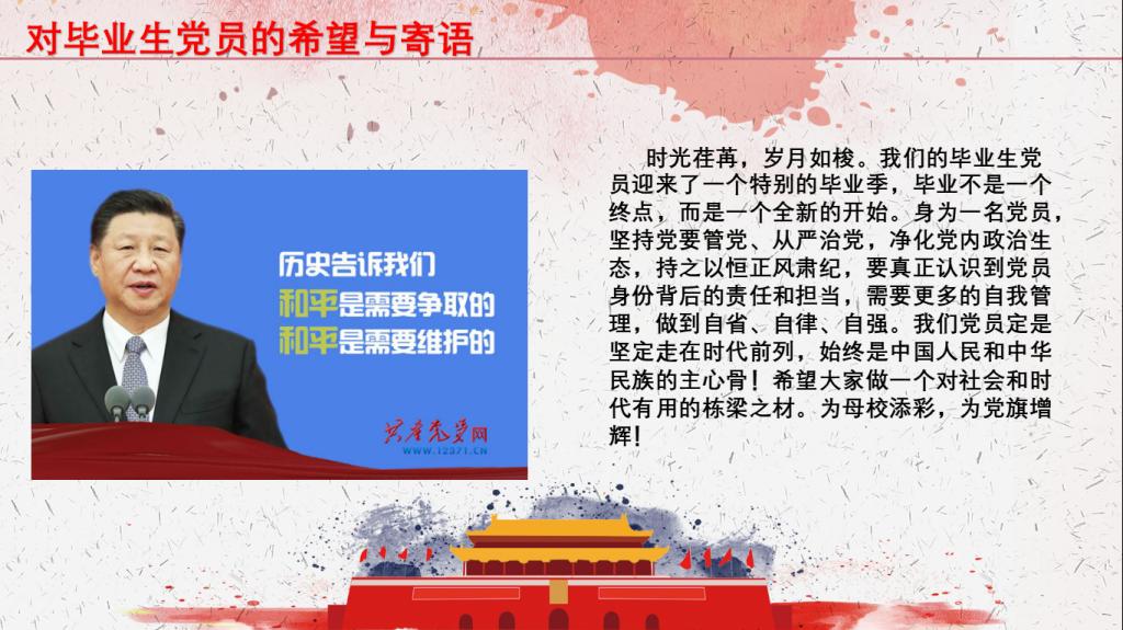 会议伊始,全体奏唱国歌,紧接着,主持人李艳芳同志带领全体毕业生党员重温入党誓词。“我志愿加入中国共产党,拥护党的纲领,遵守党的章程……”誓词入耳入心,敦促毕业生党员们始终铭记入党初心、时刻牢记党员使命,将个人理想与党的事业相结合,投身实现中华民族伟大复兴的征程。
