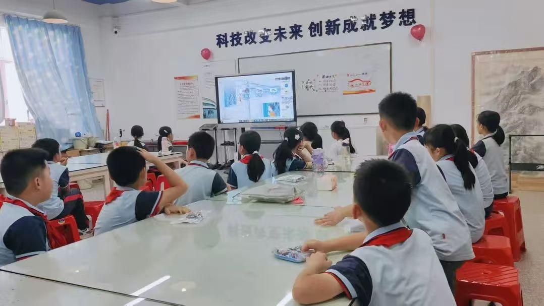 活动正式开始,队伍与学生进行了一场破冰行动。其中包含了看色块猜动画人物、表情猜猜乐,你画我猜接力赛等互动游戏。课堂充满欢声笑语,学生兴致勃勃,积极地参与到各个游戏环节当中来。每组选择一位学生代表出战,根据屏幕上呈现的色块组合来猜出对应的动漫人物。在实践队员的主持下,学生踊跃参与,极快抢答,为小组带来加分的同时,也为课堂增添了欢趣。在实践队员的调动下,每个人的脸上都洋溢着快乐的笑容。