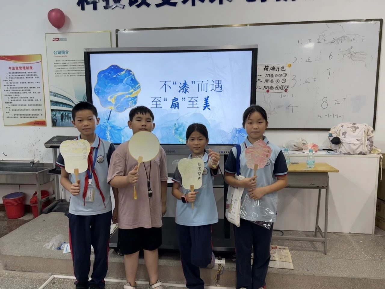 制作完成后,孩子们骄傲地展示自己的作品。色彩斑斓的漆扇在灯光下流转着绚丽的光芒,充满各自独特的色彩。大家相互欣赏、交流,分享创作背后的小故事,现场洋溢着满满的成就感与欢乐氛围。