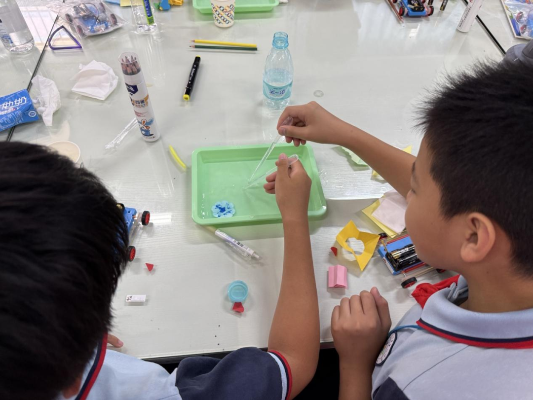 突击队员引导学生进行水上开花、酒精小船等小实验,每个小实验都有其特点与科学知识。水上开花如同一场在水面上绽放的魔法,纸花在水面上缓缓绽放。酒精小船运用酒精和水的表面张力差异,让小船动起来。水上烟花在水面绽开的那一刻,五颜六色的水面,是童真与科学的结合。