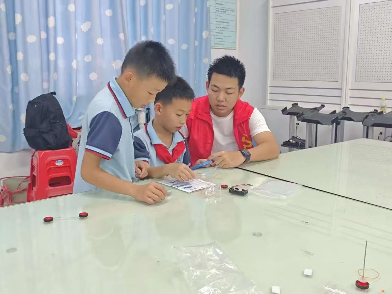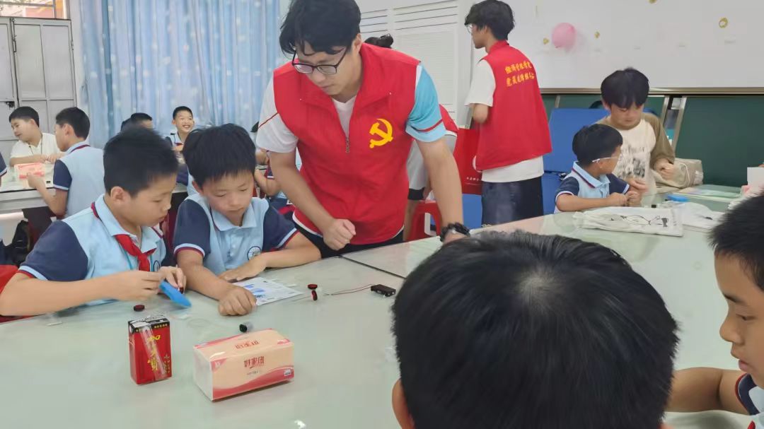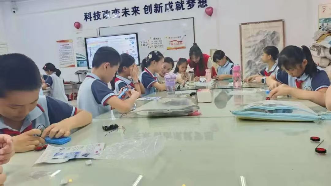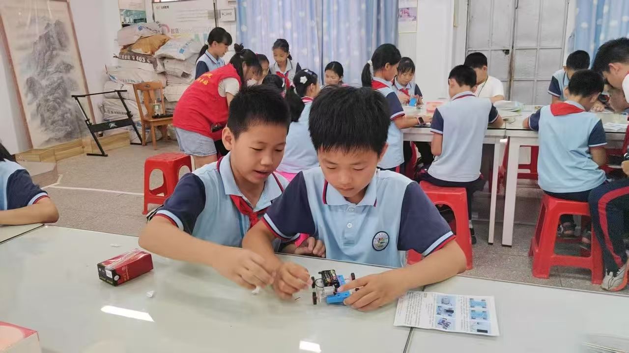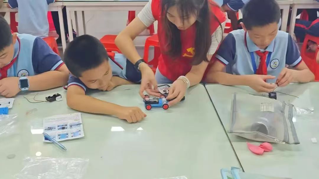“育梦无界,创意助学”突击队成员们带领学生开展小红车模型组装活动。在志愿者指导下,孩子们分组完成车体拼装、电路连接及动力调试等环节。