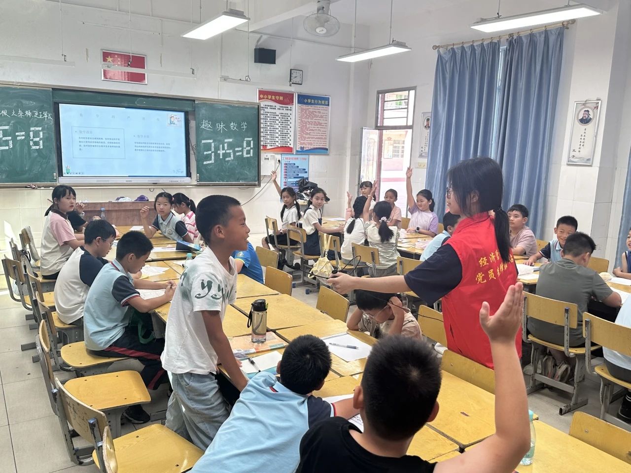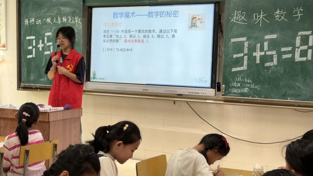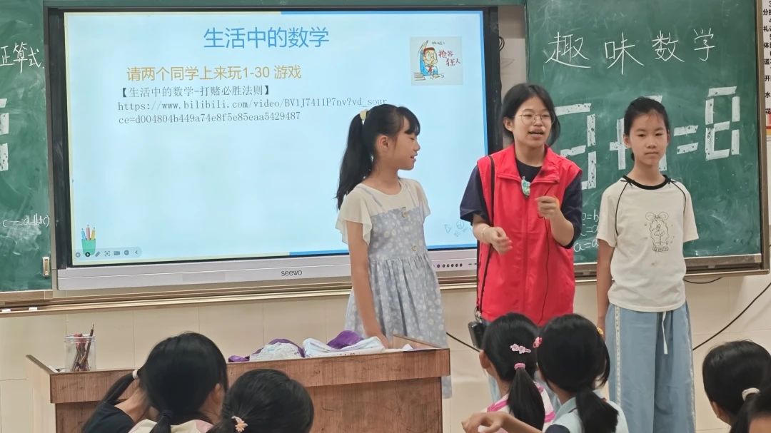 突击队员精心准备了一系列精彩纷呈的数学小游戏,如“穿过A4纸”、“读心术”、“1-30”等。通过精彩的演示与互动,巧妙地调动起课堂氛围,激发学生们的学习热情,让他们更加积极主动地投入到课堂学习中。