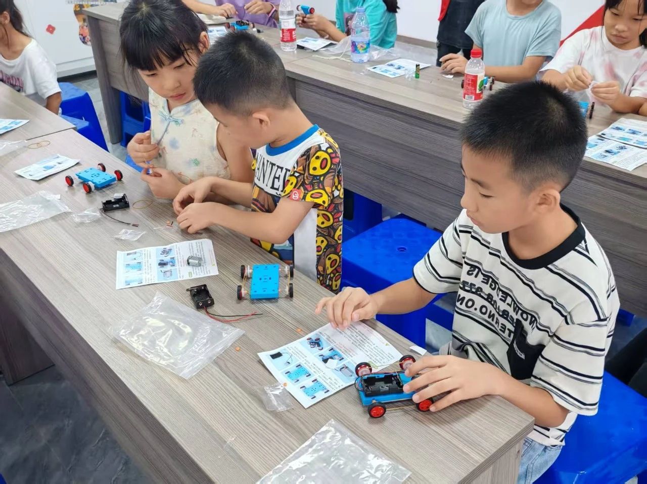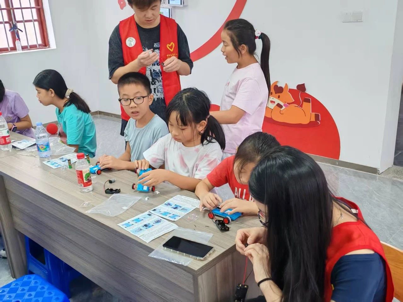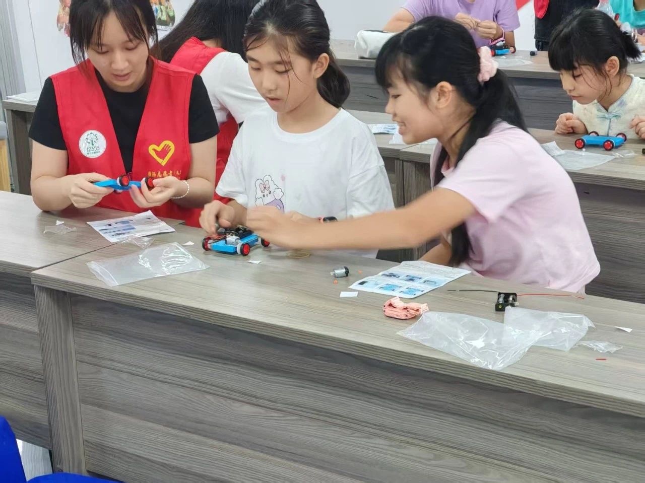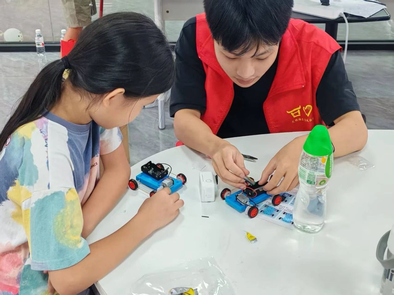 分组协作时,孩子们分工明确:看说明书、拧螺丝、接电路,忙得热火朝天。遇到难题,志愿者陪伴,一起试错、研究,“正负极接对才会跑”、“车轮装反会跑偏” ,失误成了学习契机。