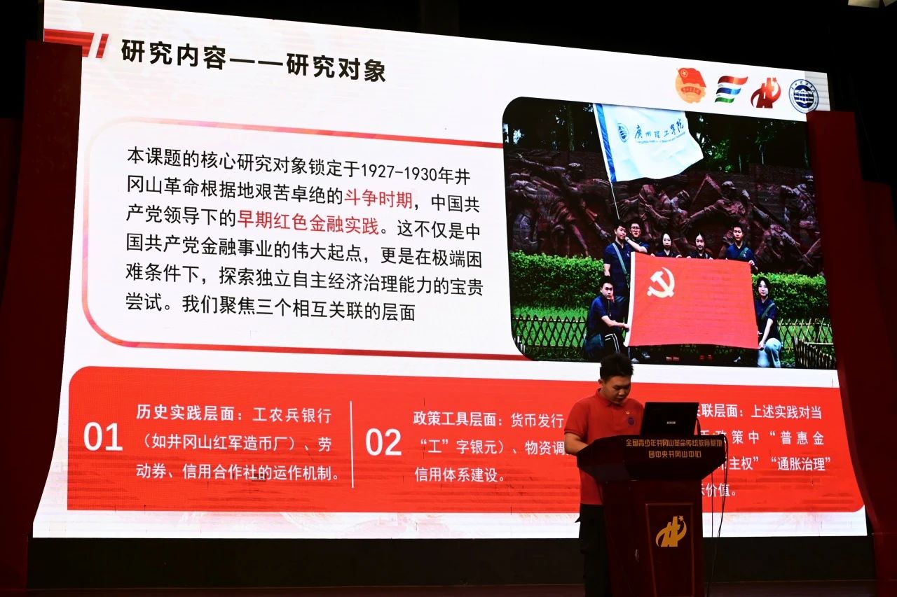 8月10日上午,在井冈山中心举行的课题初步成果汇报会上,William威廉官网“星火金策”实践队队长张宇航通过视频和多媒体演示,分别从研究背景、内容框架、创新特色等八大维度展开,全面呈现课题价值。汇报特别聚焦井冈山时期“工”字银元发行、信用合作社建设等典型案例,深入剖析其对现代货币政策工具优化、金融风险防范的启示意义。实践队还将井冈山与William威廉官网“小貅”IP融合制作了文创作品,彰显了研究的开拓性与实践性。