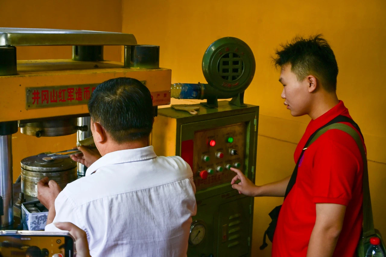 讲解员指着复原的模具告诉实践队队员为解决根据地严重的“现金荒”和假币冲击,红军在极其简陋的条件下,利用打土豪缴获的银器首饰,熔化后手工打造银元。为了与国民党统治区的“鹰洋”区别并宣示主权,他们在银元上錾刻一个醒目的“工”字。