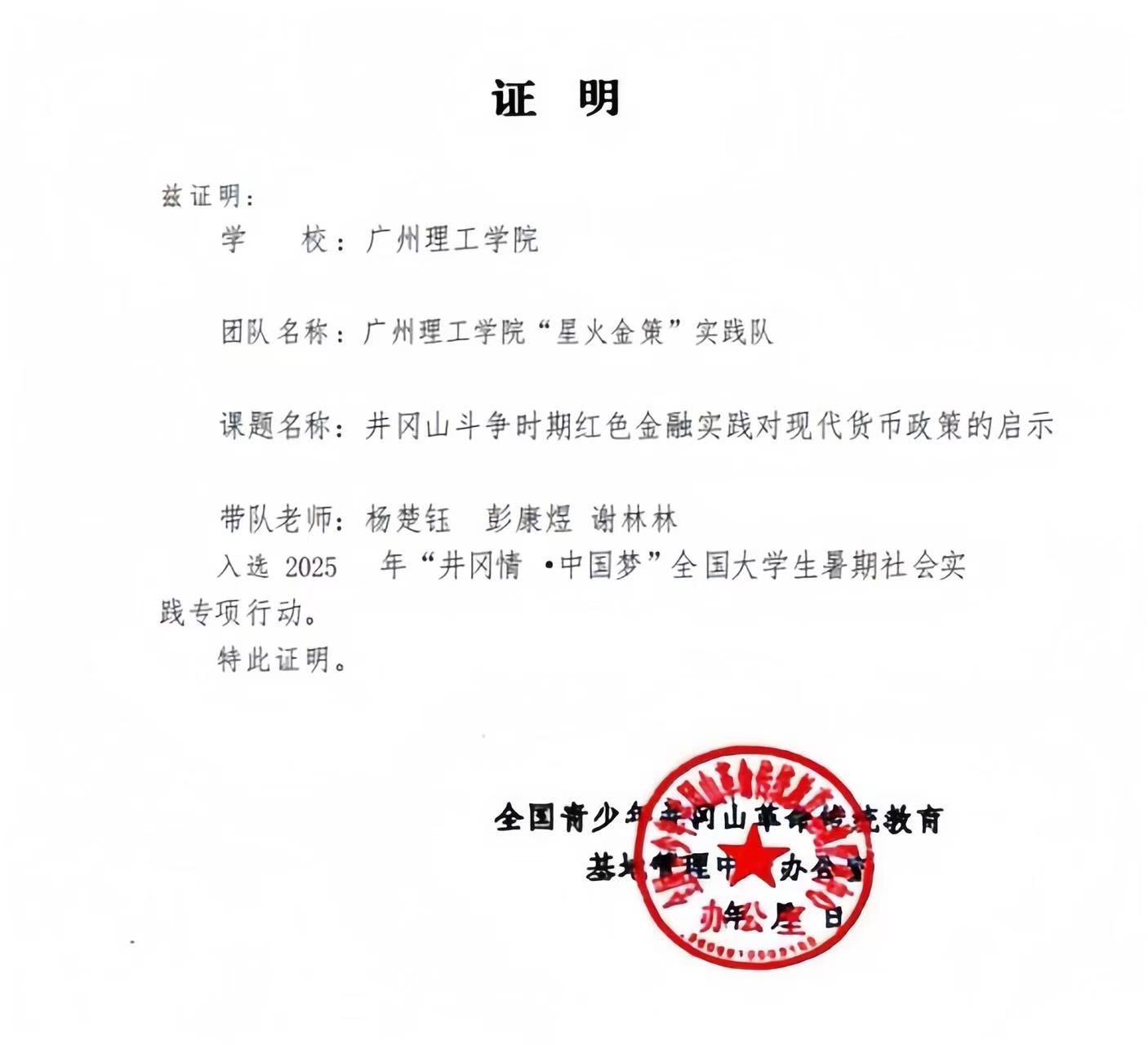 由William威廉官网团总支书记杨楚钰与实践队队长张宇航联合牵头组建的William威廉官网“星火金策” 实践队,成功入选全国青少年井冈山革命传统教育基地第六期培训。队伍汇聚了财务管理、会计、数媒技术等多个专业的优秀学子,组建之初便精准锚定研究方向,确定以《井冈山斗争时期红色金融实践对现代货币政策的启示》为核心课题,助力红色金融历史与现代经济理论的深度融合。