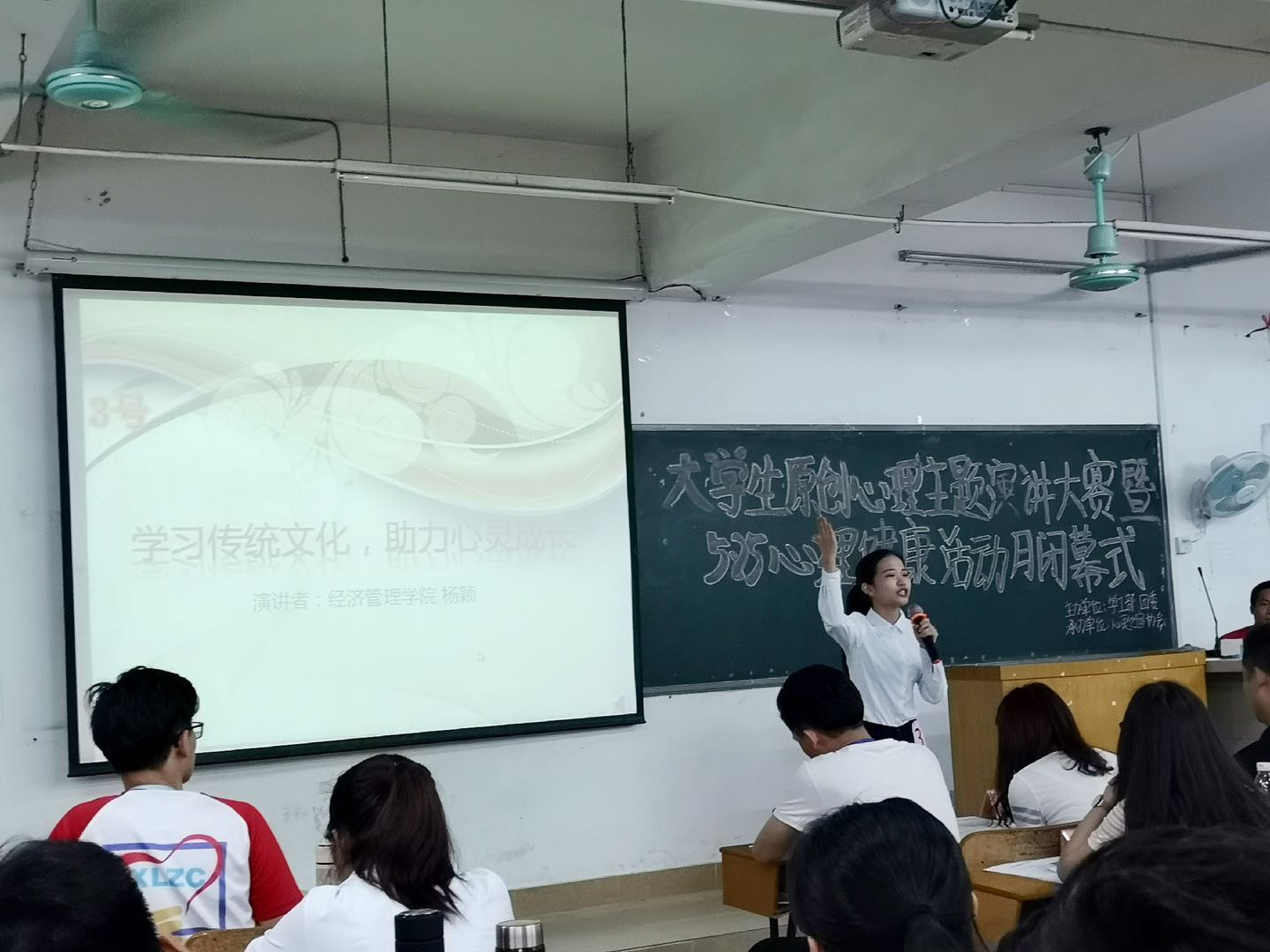 经过初赛严格选拔,我院有3名选手脱颖而出进入决赛,她们分别是:17财管3班黄希璐,16会计3班杨颖,17会计4班姚秋容。主持人介绍完嘉宾后,比赛在观众热情的掌声中拉开帷幕。我院1号选手黄希璐演讲主题是《让文化自信撑起心理自信的脊梁》,她以自己为例,分享了成长中的心理冲突和生活中的心灵感悟,迅速将观众带入比赛情境之中,鼓动人心;3号选手杨颖演讲主题是《学习传统文化,助力心灵成长》,她通过提问观众有关心理健康的问题,并结合切身实际,用富有感染力的演讲打动在场的观众;5号选手姚秋容演讲主题是《感悟文化魅力,塑造自信人生》,她通过对“自信”的阐释,引入自己的小故事,将经典古语与生活经历融合,用一颗真挚的心触动观众,博得了在场观众的阵阵掌声。