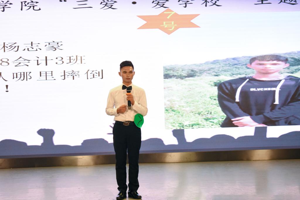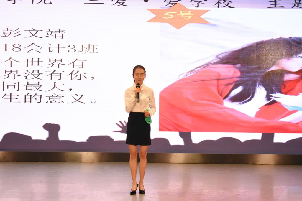 经过初赛和复赛的重重选拔,十名选手脱颖而出,站上了决赛的舞台。本次比赛共两个环节,第一环节是十名选手依次进行以“三爱·爱学校”为主题的演讲。随后的中场互动环节亦是精彩不断,被抽中的观众上场听歌识曲,竞猜歌名并赠送小礼品。第二环节中选手以自由组合方式为观众表演了幽默风趣的小品和相声。紧接着我院文艺队队员郑炎烨为现场带来了歌曲《安静》。比赛结束后,辅导员张宁对十位选手的表现做了一番精彩点评。最后,祝贺18会计3班彭文靖荣获此次比赛的冠军,18财管班梁倩瑜获得亚军,18会计3班杨志豪获得季军。