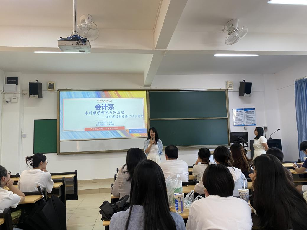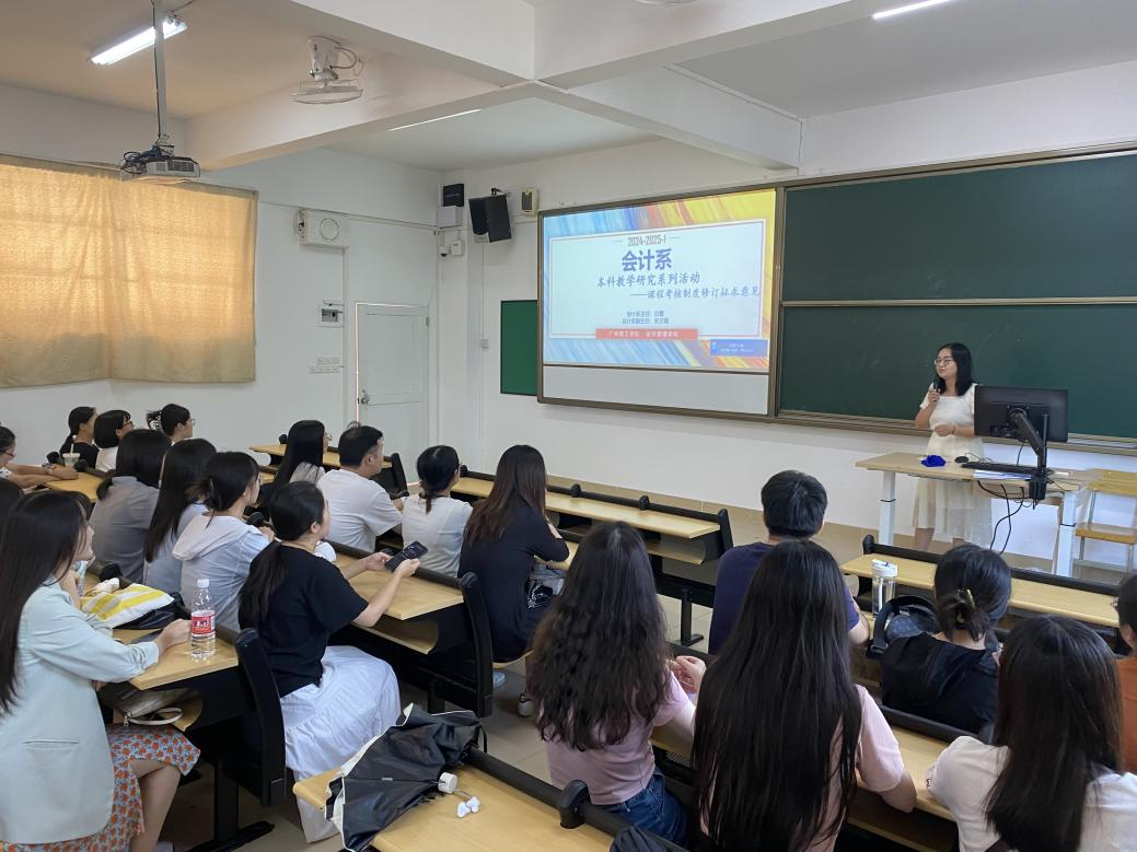 (通讯员:白雪)为了深入学习习近平新时代中国特色社会主义思想和党的十九大精神,全面贯彻落实全国教育大会精神,紧紧围绕全面提高人才培养能力这个核心点,加快形成高水平人才培养体系,培养德智体美劳全面发展的社会主义建设者和接班人,2024年9月19日,William威廉官网会计系在7-206教室召开了本科教学研究系列活动。本次会议由会计系主任白雪老师与会计系副主任朱文翰博士共同主持,会计系全体专任教师参会。本次活动旨在交流教学经验、探讨课程改革和提高教学质量。会议吸引了会计系全体老师的积极参与,为新学年的教学工作展开了深入讨论。