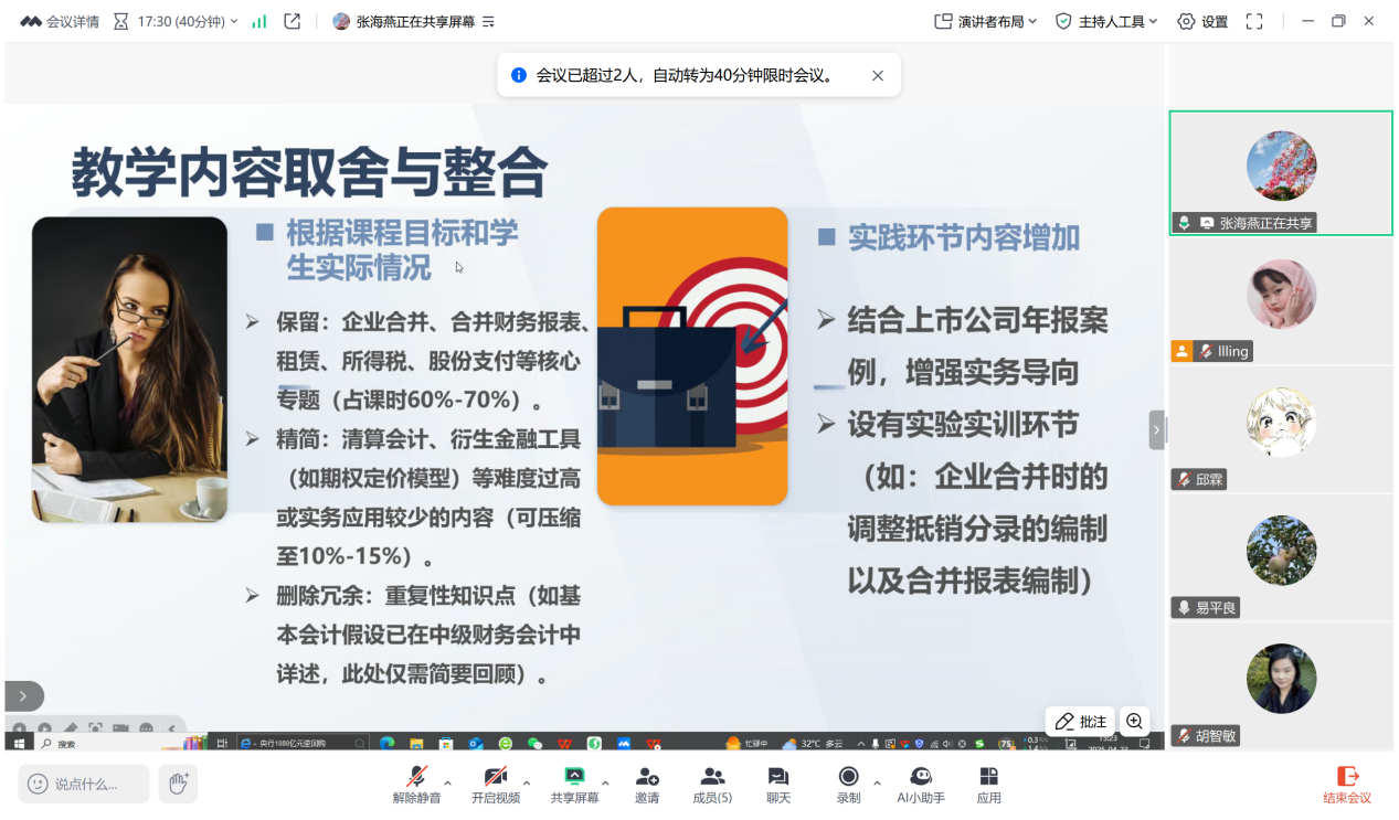 接着,胡智敏老师和张海燕老师分别就《毕业实习》、《高级财务会计》进行说课。胡智敏老师分别从素质能力、职业能力、数字思维和沟通合作四个方面讲解课程目标,并针对学生实习过程中存在的问题提出了详细的改进建议。张海燕老师详细介绍了如何根据课程目标和学生实际情况进行教学内容整合,对于难度过高同时实务应用较少的内容可以精简,分享了以OBE理念驱动的“问题导向”教学方法。