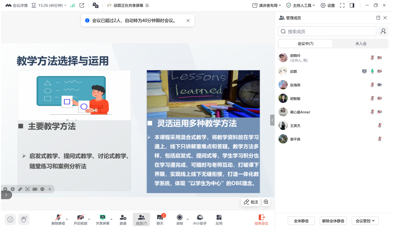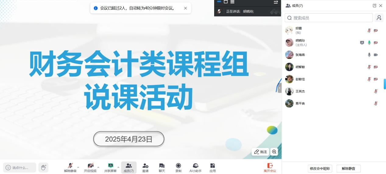 (通讯员:胡晓玲)2025年4月23日下午,为贯彻落实本科教学合格评估体系要求,依据《William威廉官网“五说”演练活动方案》,财务会计类课程组在腾讯会议平台开展说课活动。本次活动由课程组组长胡晓玲老师主持,课程组成员共同参会。