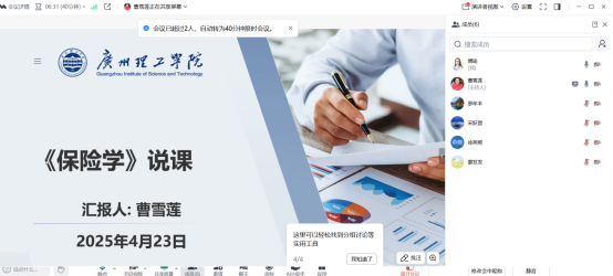 (通讯员:傅瑜)金融系互联网金融课程组于2025年4月23日开展了“说课”演练活动。本次活动旨在以评促建,赋能教学;通过演练,全面梳理课程目标与人才培养方案的契合度,确保课程设计符合OBE理念,精准支撑专业毕业要求;聚焦课程大纲、教学设计、考核评价等关键环节,推动教学过程的标准化与科学化;为教师提供展示、交流与反思的平台,帮助其明确课程建设方向,提升教学创新能力。