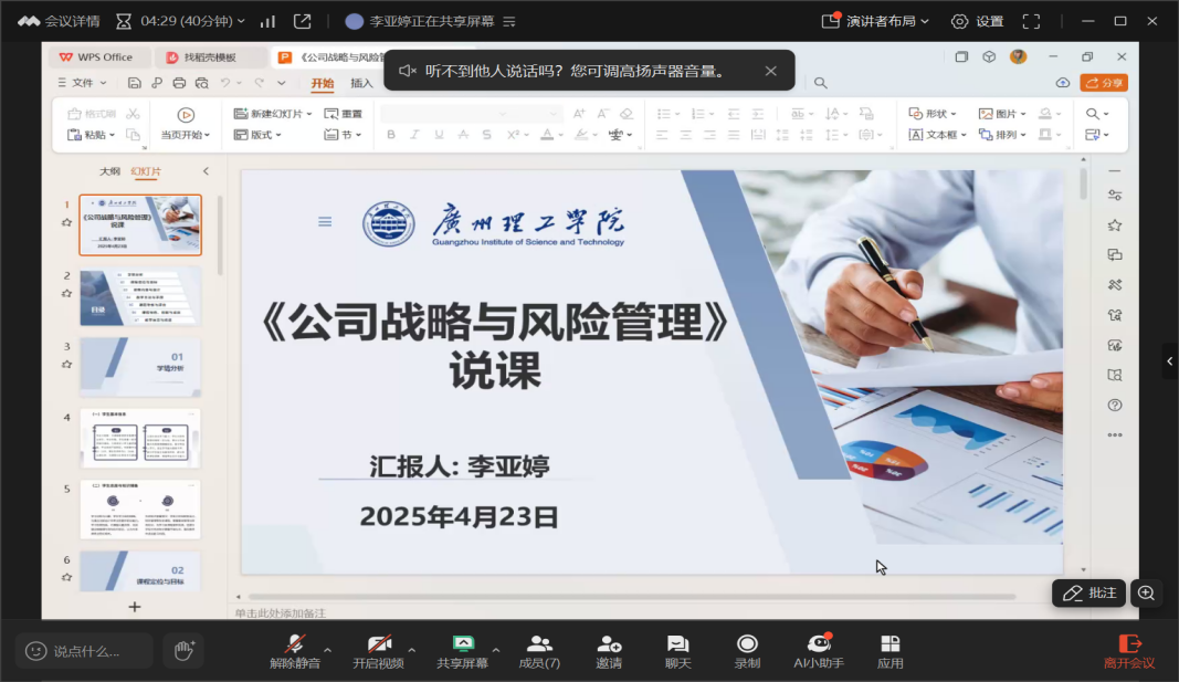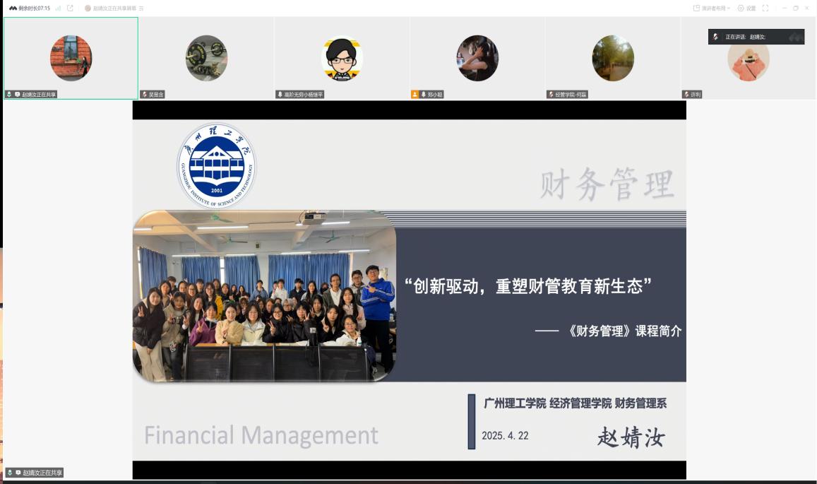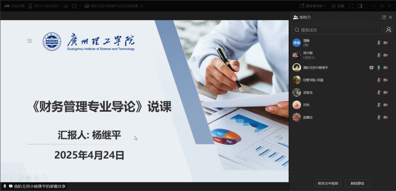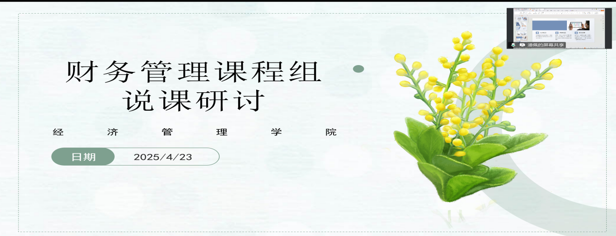 2025年4月23日晚7点,财管系财务管理课程组积极响应学校合格评估检查要求,组织开展了专题说课活动。潘佩、许利、吴昱含、杨继平、赵婧汝、李亚婷六位教师依次进行课程展示,围绕课程设计、教学方法与专业特色等展开交流,课程组全体教师参与研讨。