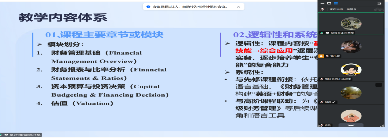 吴昱含老师在《财务管理英语》说课中突出双语教学特色,通过国际案例分析和英文财报解读,培养学生跨文化财务沟通能力。杨继平教授则围绕《财务管理专业导论》的课程定位,以思维导图、互动游戏等多样化手段帮助学生构建财务知识框架,激发学习兴趣。
