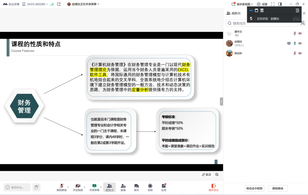 最后,赵婧汝老师对《计算机财务管理》课程进行了系统讲解。她结合当前大数据与人工智能的发展趋势,展示了如何将Python、Excel高级建模等工具融入财务分析教学,帮助学生提升数据决策能力。赵老师还分享了课程中的“项目式学习”案例,如财务预测模型、风险管理分析等,使学生在实践中深化对理论的理解。