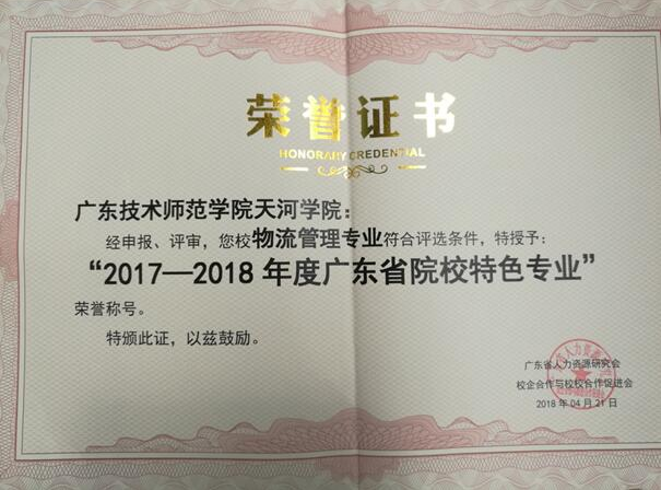 4月21日,由广东省人力资源研究会、广东省校企合作与校校合作促进会、《中学生报》、广东教育杂志社、广东电视台、广州日报社、广东省生涯教育研究院、广东校园人才网等联合举办的广东省院校招生、就业、校企合作优秀管理者表彰大会和特色专业发布会在天河人才港隆重举行会上我校工商管理学院物流管理专业被评为“广东省院校特色专业”。