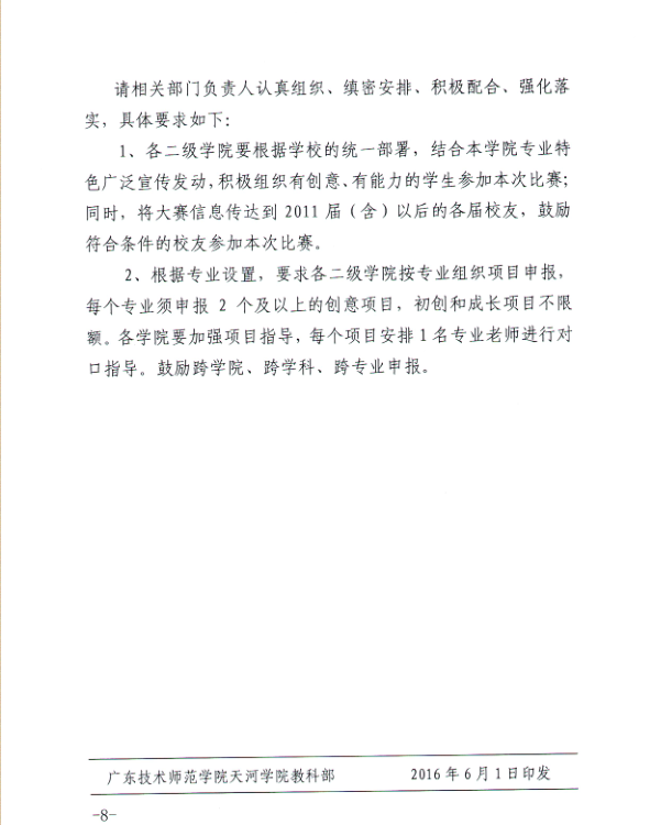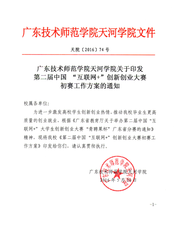 天院〔2016〕74号广东技术师范学院天河学院关于印发第二届中国 “互联网+”创新创业大赛初赛工作方案的通知