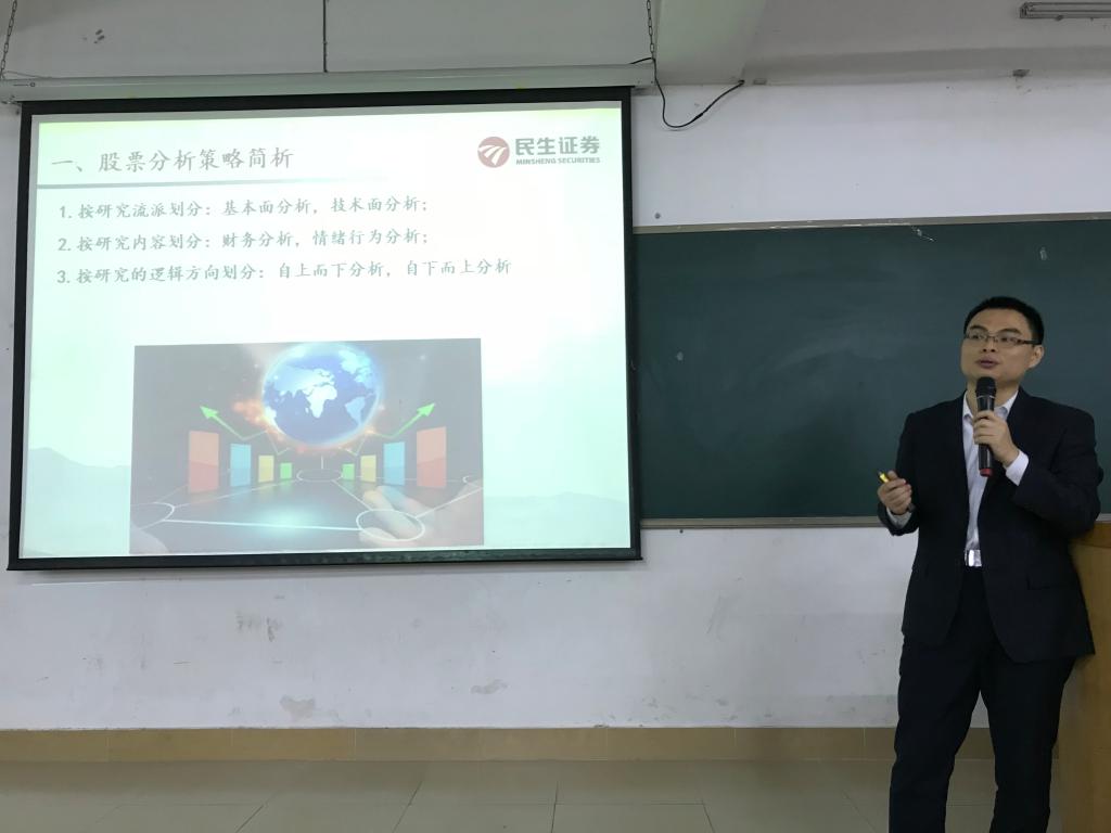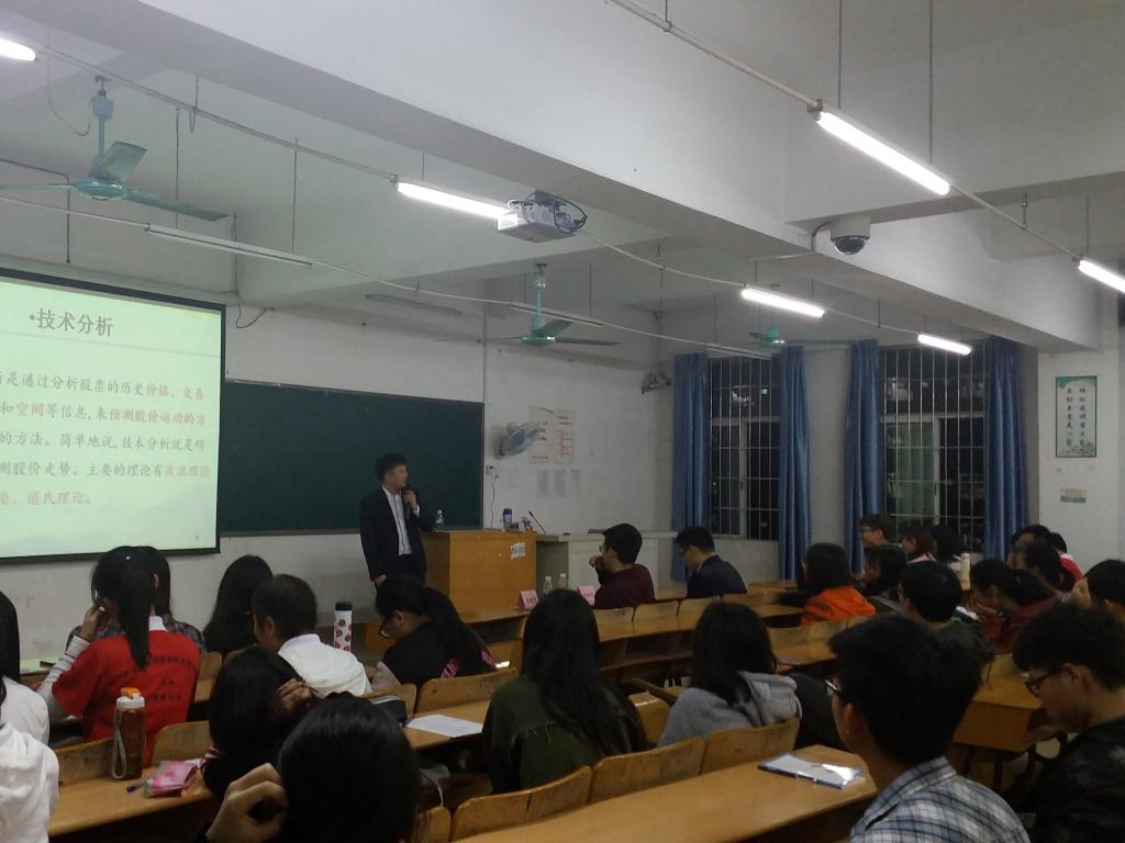 (通讯员 张建龙)11月28日晚,第五届“民生证券杯”证券投资大赛第二次讲座在7-318开讲。民生证券广州营业部投资顾问赵栩龙、伍仕君两位老师分别以实战选股与心态控制策略、证券投资技术指标分析为题给大家讲解了证券投资分析策略,分享了投资经验与技巧。我院副院长陈天勇、实验中心副主任、大赛指导老师张建龙老师参加了本次讲座。