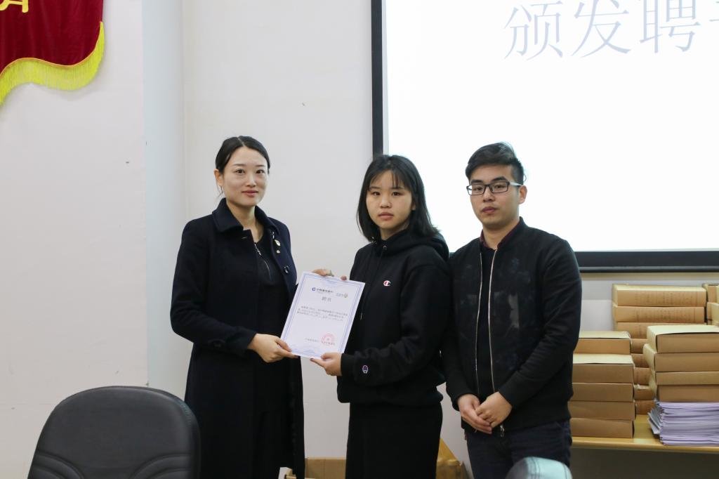 会上,第二届校园e银行行长邱柔邱柔与大家分享她过去一年的工作经验,发表离职寄语。紧接着,新老行长正式进行交接仪式,建设银行天河路支行行长助理王婷为校园e银行新任学生行长颁发了聘书。新任学生行长林淑贞发表就职演说,对校园e银行目前存在的问题提出意见和解决方案的同时,她介绍了校园e银行团队的5位新成员,他们分别是:谢震、张漫、陈裕菁、黄瑞盈、谭钰瑾。