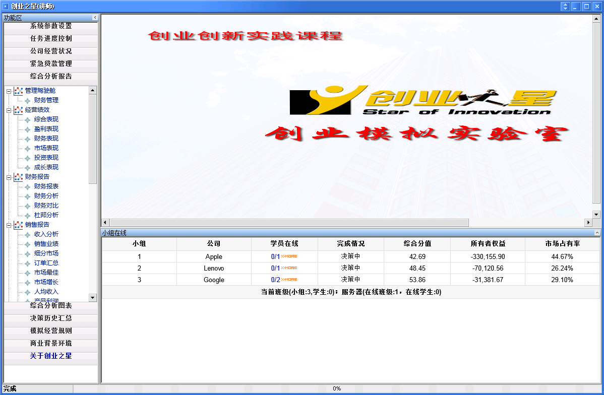 • 主要功能:在《创业之星》中,所有小组组建的公司之间是相互对抗竞争的,每个公司的目标就是使公司实现经营目标,并战胜其他公司。期间,每个小组需要独立做出众多的经营决策,使创业企业能够逐步成长壮大,这些经营决策涉及企业战略、营销、财务、生产、研发等各个方面,因此,如何综合考虑各种因素的影响,充分发挥团队的作用,是制订有效决策的关键。同时,团队合作、沟通技巧、执行力等也是整个决策过程中至关重要的环节。学生端程序包括了。各小组必须在规定的时间内,利用团队的力量,通过对本企业实时数据及竞争对手数据的分析,制订企业运营中的各项管理决策,与其他学生组成的虚拟企业展开竞争,并努力使企业绩效达到最佳,学生可以从中认识企业管理,学习企业经营管理知识。