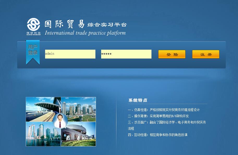 主要功能:综合实习平台为学生提供国际贸易全程仿真的实验和实习环境,软件将外贸交易过程中涉及到的外经贸局、银行、保险公司、出入境检验检疫局、海关、外汇管理局和外运公司等多个角色进行了很好的体现。学生在软件中可仿真模拟进、出口公司进行国际贸易交易,贸易磋商、签订合同、进出口许可证申请、产地证明、审证改证、开具商业发票、货物托运、商品投保、报关、报验、制单结汇、审单付汇、业务善后、发送单证等环节,可得到充分的锻炼和运用。