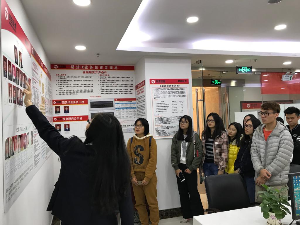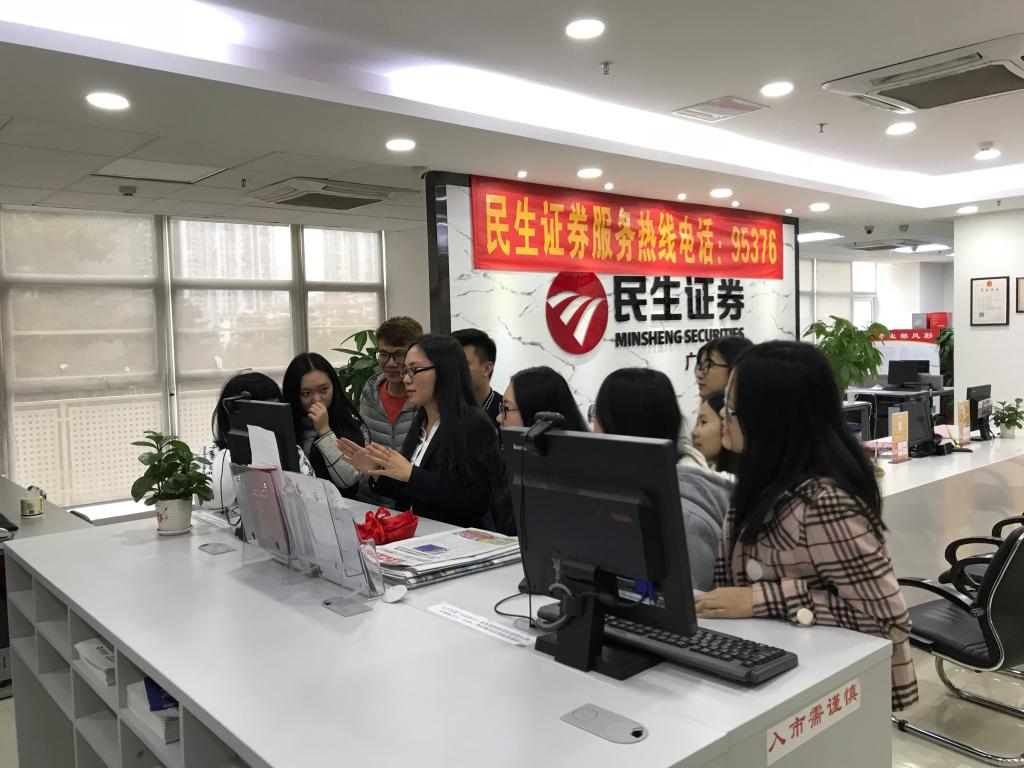金融学术协会罗琳琳等10名学生在我校15级毕业生林耿芳助理带领下参观了民生证券广州营业部,林耿芳就公司文化、组织架构、岗位职责等向同学们进行了介绍,并向同学们讲述自己在民生证券的成长经历。