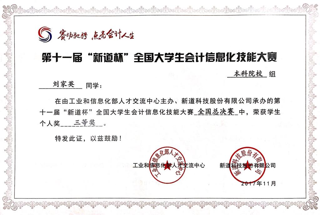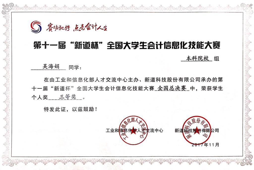 11月29日,由工业和信息化部人才交流中心主办、用友新道科技股份有限公司承办的2017年全国会计信息化技能大赛全国总决赛落下帷幕,我校财经学院吴海娟、刘家英同学荣获三等奖,陈天勇、张建龙老师荣获优秀指导老师。