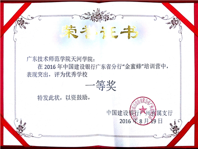 8月19日下午,中国建设银行广东省分行2016年暑期“金蜜蜂”培训营结业典礼在省分行广州直属支行会议室举行,我院荣获建设银行省分行“金蜜蜂”培训营优秀学校一等奖,我院张玉玲、陈映婷、蔡小祝、李祖儿、吴鸿霓五位同学被评为优秀学员。