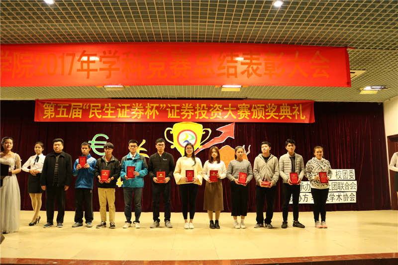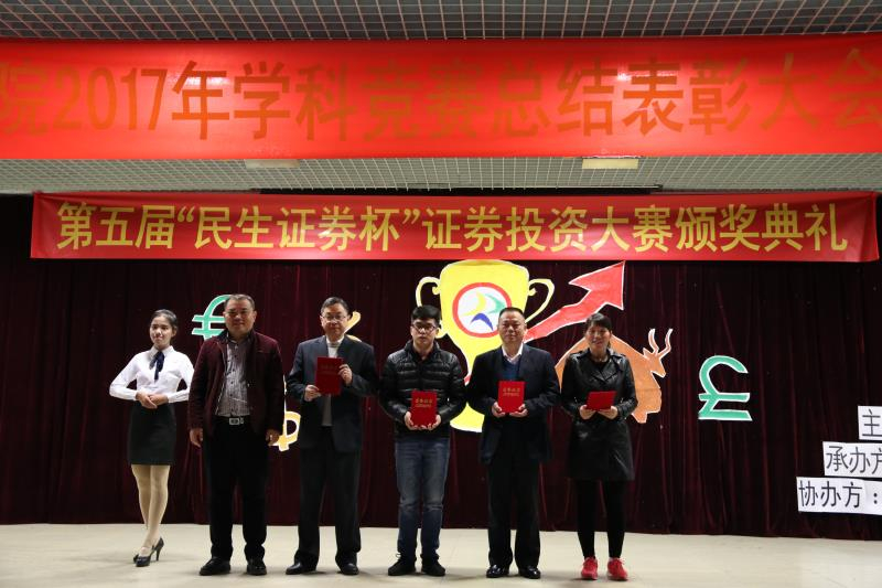 (通讯员 张建龙)12月26日下午,财经学院2017年学科竞赛总结表彰大会暨第五届“民生证券杯”证券投资大赛颁奖典礼在学术报告大厅隆重举行。民生证券广州营业部副总经理杜永红、投资顾问叶会飞、投资顾问助理林耿芳莅临大会,财经学院副院长张志红、党总支书记谭飞、副院长陈天勇、办公室主任段妍君、各竞赛指导老师及16、17级学生代表参加了大会。