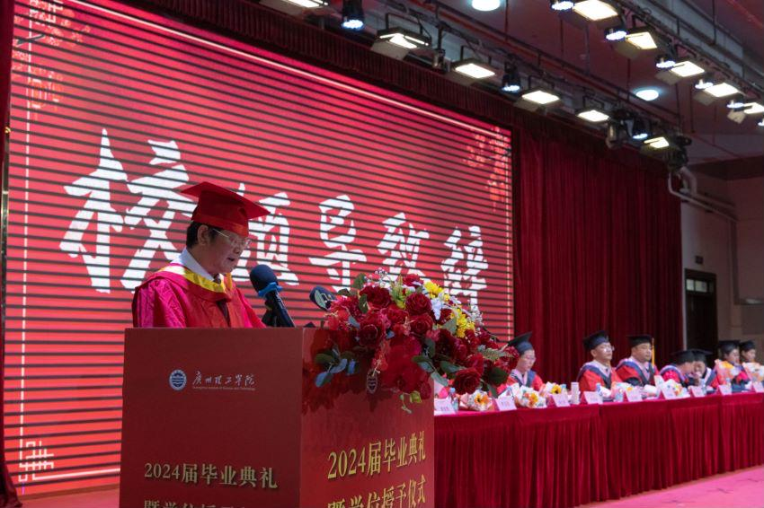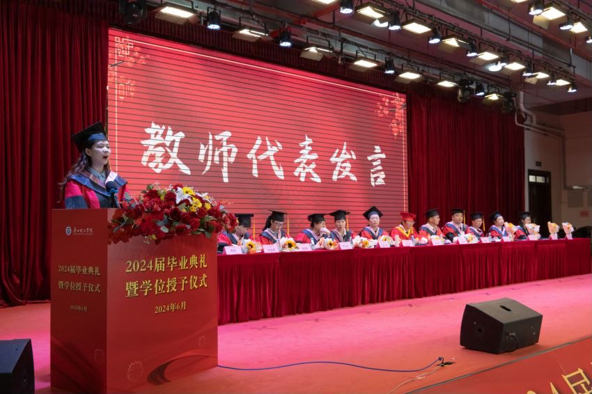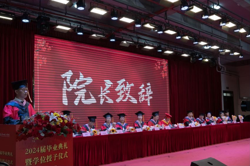 典礼第七项议程,张日新副校长致词。张日新副校长以丰富的经验和深厚的情怀为即将踏入社会的毕业生们送上最真挚的祝福和最殷切的期望。希望同学们保持初心,砥砺奋进,怀揣实现中国梦的坚定信念与优良品德,勇敢而有担当,不懈地追求心中的理想,同时表明学校永远向大家敞开怀抱,祝愿同学们在珍贵的时间长河里破浪高飞,直挂云帆济沧海!