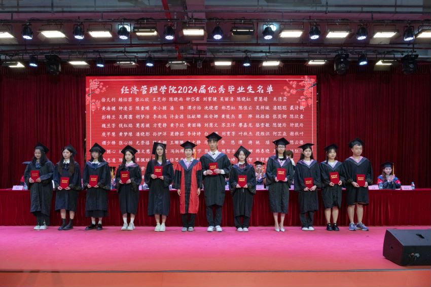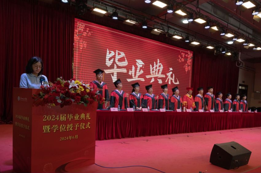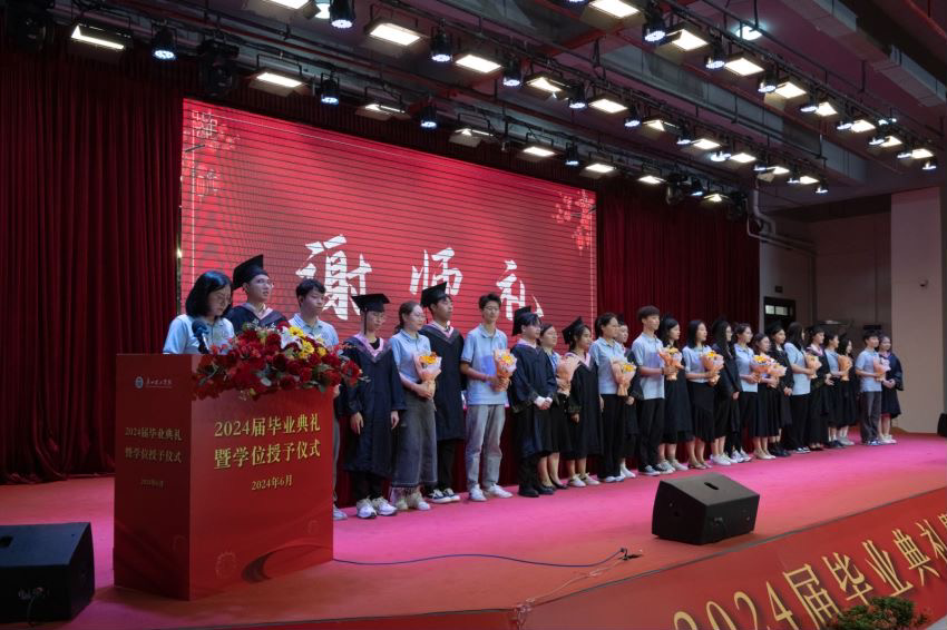 典礼第二项议程,副院长李美珍宣读关于同意授予2024届139名优秀毕业生荣誉称号的表彰决定,由副院长陈少英为优秀毕业生颁发荣誉证书。希望受表彰的优秀毕业生们珍惜荣誉,在今后的学习和工作中发挥模范表率作用,希望其他同学以优秀毕业生为榜样,在新的工作和学习生活中,不断开拓创新,积极进取,为母校争光。同时宣读了关于2024届14名毕业生考取硕士研究生的表彰决定,由彭康煜书记为考研学生颁发荣誉证书。希望考取硕士研究生的同学再接再厉,在新的起点上取得更好地成绩。同时,也希望在校同学以他们为榜样,刻苦学习,奋发进取,再创佳绩。